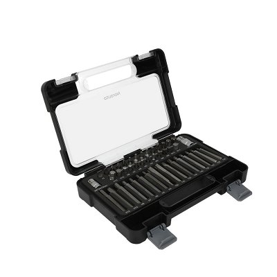 Le coffret NORAUTO de 44 pièces comprend : - 1 adaptateur carré 3/8'' DR x 10 mm HEX en chrome vanadium pour plus de solidité - 1 adaptateur carré 1/2'' DR x 10 mm HEX en chrome vanadium pour plus de solidité - 2 embouts plats (tête fendue) : SL10 et SL8 mm - 3 embouts Phillips (croix arrondie) : PH1, PH2 et PH3 - 9 embouts Torx : T20, T25, T27, T30, T40, T45, T50, T55 et T60 PH1, PH2 et PH3 - 9 embouts Torx : T20, T25, T27, T30, T40, T45, T50, T55 et T60 - 7 embouts Allen : H4, H5, H6, H7, H8, H10 et H12 - 5 embouts XZN (12 faces) : 5, 6, 8, 10 et 12.- 9 embouts Torx longs (75 mm) : T20, T25, T27, T30, T40, T45, T50, T55 et T60 - 7 embouts Allen longs (75 mm) : H4, H5, H6, H7, H8, H10 et H12.