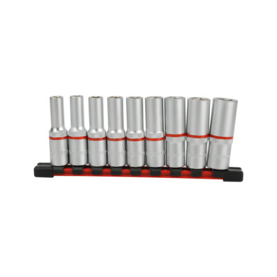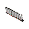 Le kit est composé de 9 douilles 6 pans : 8, 10, 11, 12, 13, 14, 17, 19 et 21 mm et d'un support de rangement.